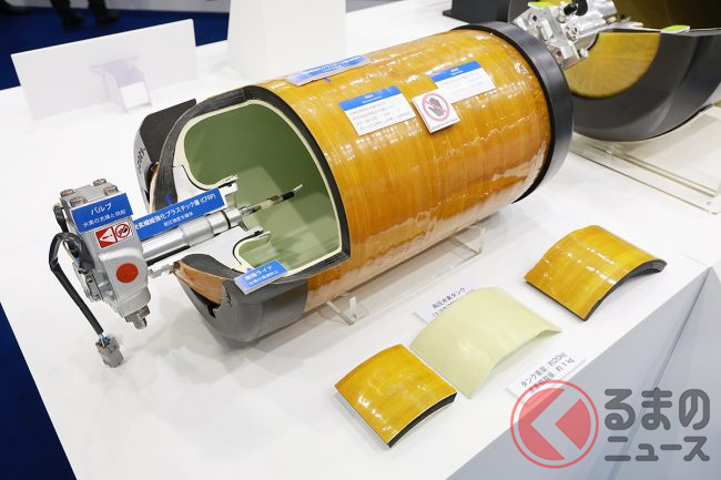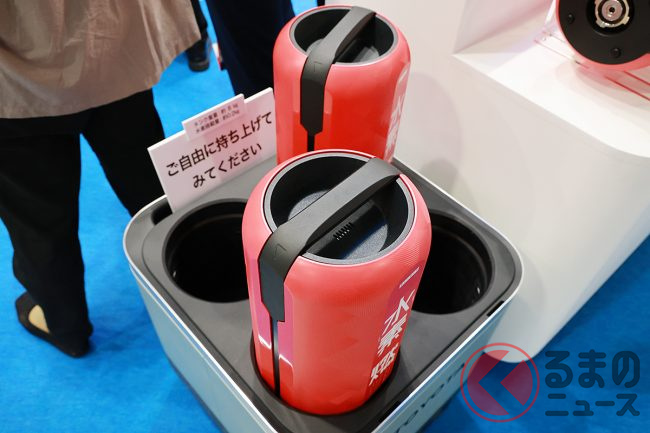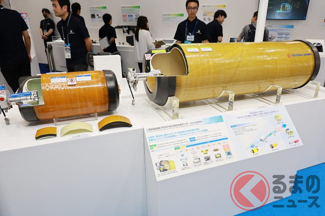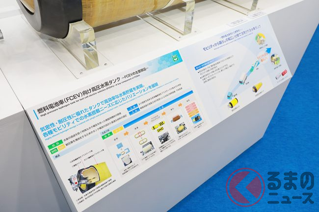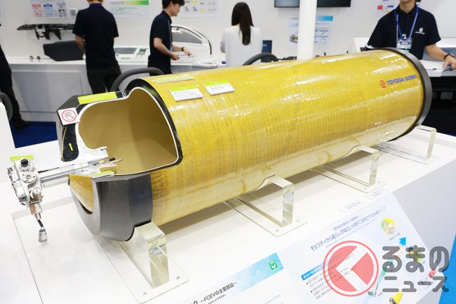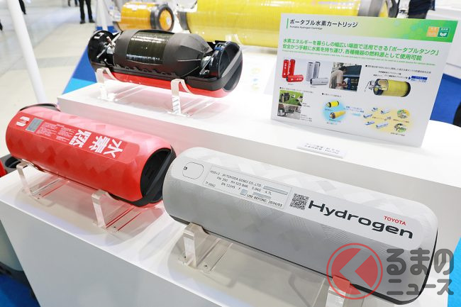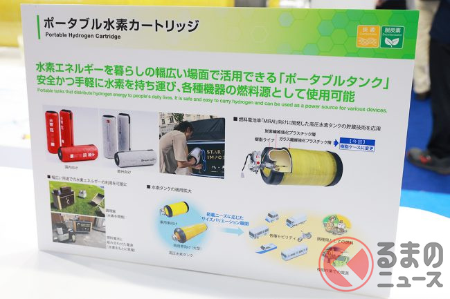 そのほか、燃料電池車MIRAI向けに培った高圧水素タンク技術を応用し、持ち運び可能な水素カートリッジの展示も行われました。
