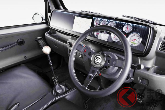 インテリアも大幅に手が加えられ、アナログ式のスピードメーターやタコメーター、ブースト計、電圧計、油圧計、水温計などが並ぶ特注メーターが装備され、視認性にも優れています。メタル製のシフトノブも個性的なアクセントとなっています。