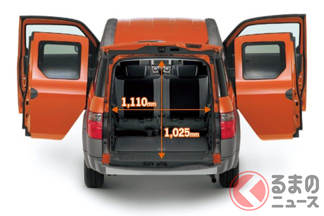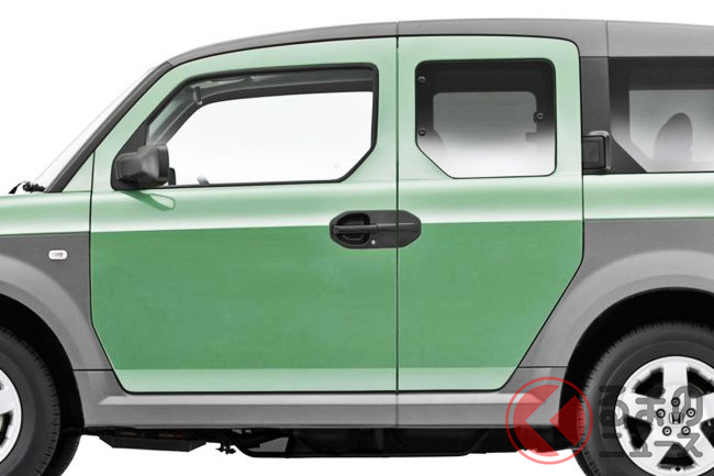 5速MTもあり! ホンダ「斬新”カクカク”SUV」がスゴかった! めちゃ「ユニークすぎデザイン」&パカっと開く“観音ドア”採用! タフすぎる「エレメント」は登場が早すぎた1台