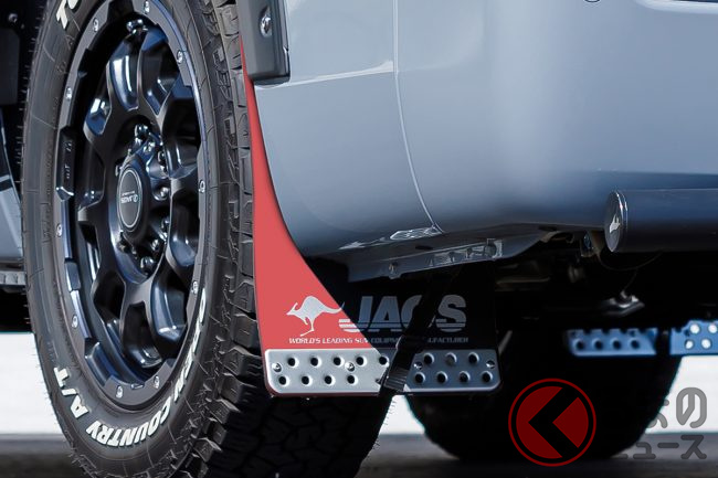 「JAOSフェンダーガーニッシュ typeX」は、ブラックのダミーボルトと強固な皮膜が特徴のタフブラックで仕上げたヘビーデューティー仕様で、1BOXボディ特有の平面の大きなサイドビューが、同製品の装着によってワイルドに引き締まると言います。