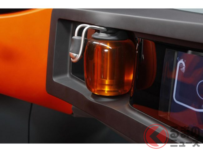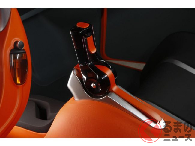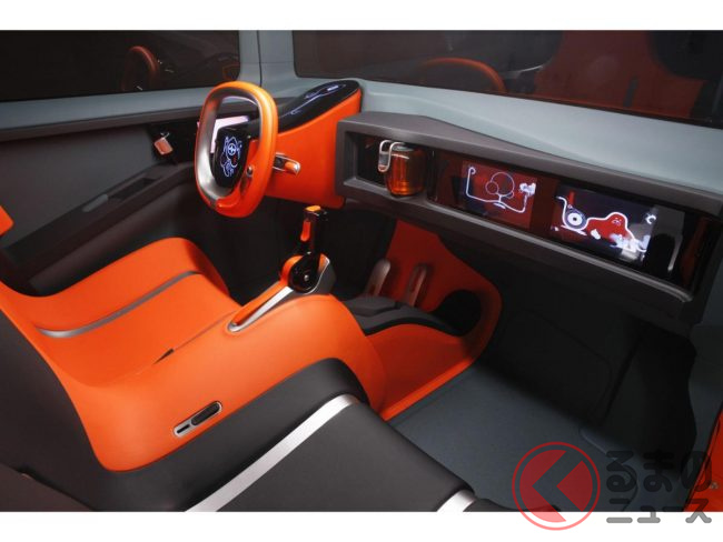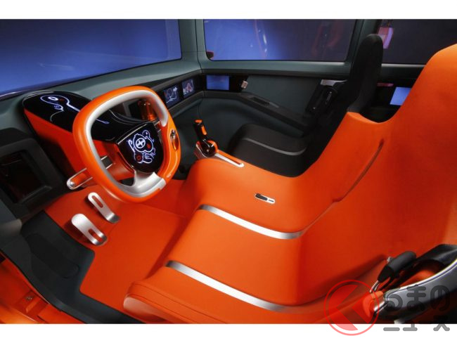 また、メタリックオレンジのステアリングホイール中央には、ゲームコントローラーのようなデザインで各種スイッチを配置。豊富な収納スペースを設けたセンターコンソールには、ジョイスティックのような形状のシフターが設置されていました