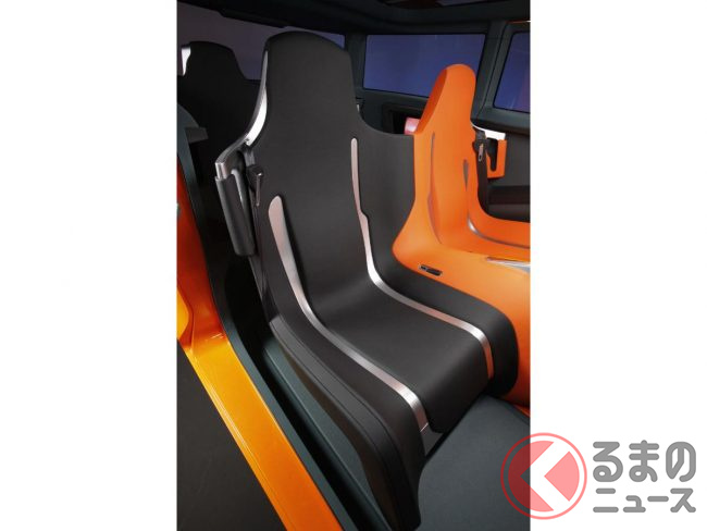 「ゲーム」をテーマとするインテリアは、オレンジとブラックを基調としていますが、運転席シートはオレンジ、助手席はブラックと色違いにするなど、独特なパターンの配色になっています。