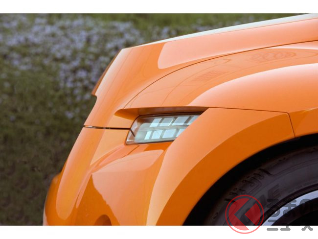 また、目立つのはキャビン部分だけでなく、フロントマスクも横長の長方形グリルや目のように見えるヘッドライトなど、こちらも印象的なデザイン。折れそうなぐらい細いサイドミラーも斬新でした。