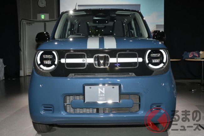ホンダ新型「軽ワゴン」初公開! 「N-BOX顔」&歴代初のパワートレイン採用! 前後に貫く“ピンストライプ”がめちゃ個性的な新型「N-ONE e:」カスタム仕様も登場!