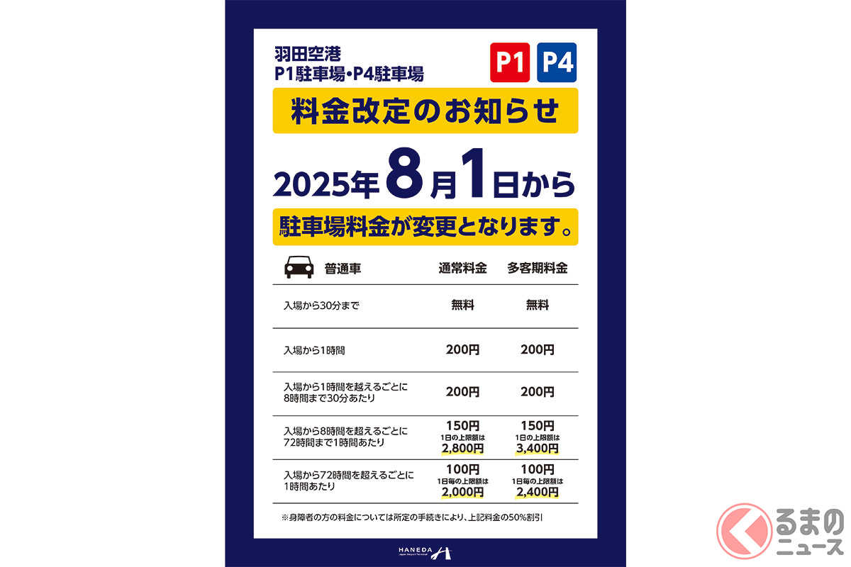2025年8月から、羽田空港のP1・P4駐車場およびP2・P3駐車場の駐車料金が値上げされることが明らかになりました。