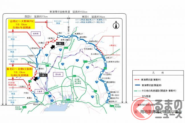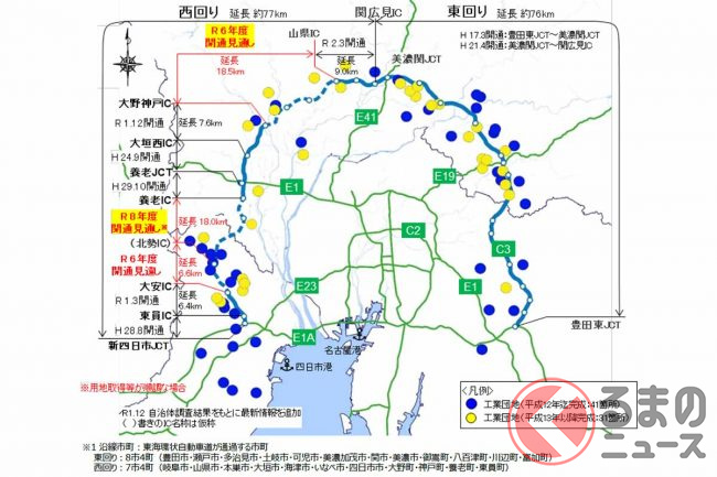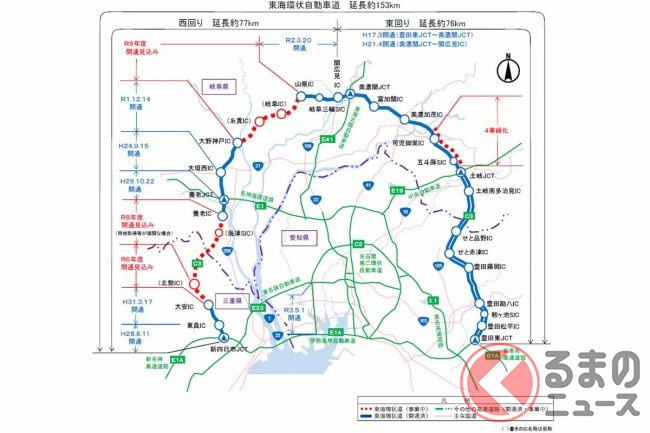 すでに「環状の右半分」となる豊田東JCT〜東海北陸道の美濃関JCTまでが開通。「環状の左半分」の美濃関JCT〜新四日市JCTは、部分的に開通しておりブツ切れ状態となっています。