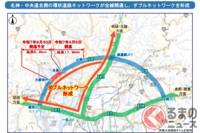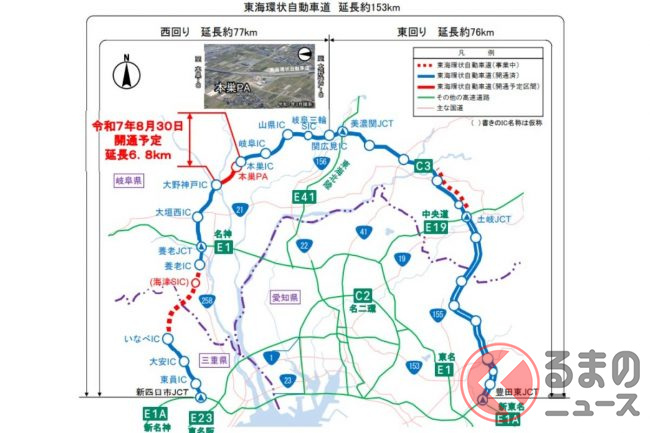 ネクスコ中日本は2025年8月30日、東海環状道の本巣IC~大野神戸ICが開通すると発表しました。