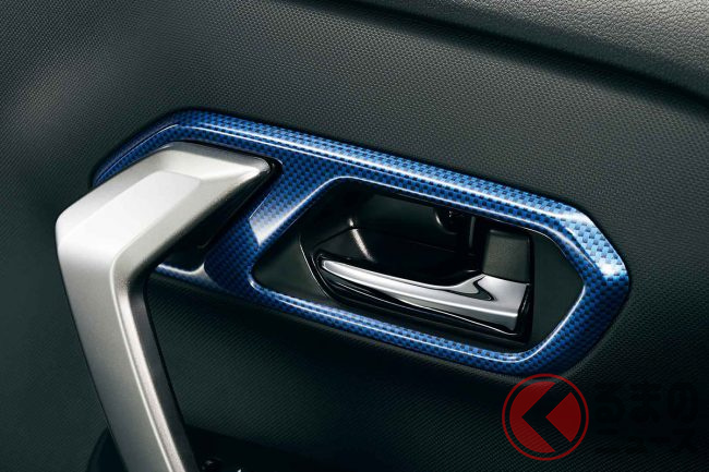 「ブルーカーボン調パック」はハイブリッドモデル専用に設定されたもので、ブルー加飾が特徴的。インナードアハンドルベゼルパネル、シフトベゼル&センターコンソールパネル、パワーウィンドウスイッチパネルの3点をブルーカーボンでまとめており、洗練されたイメージを与えます。