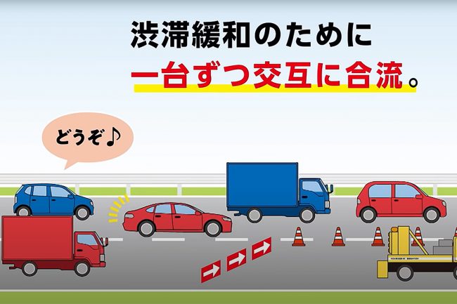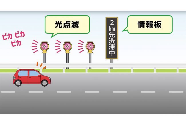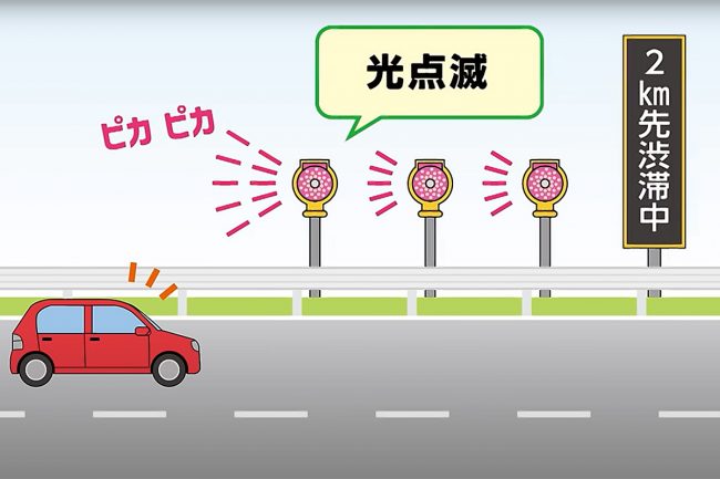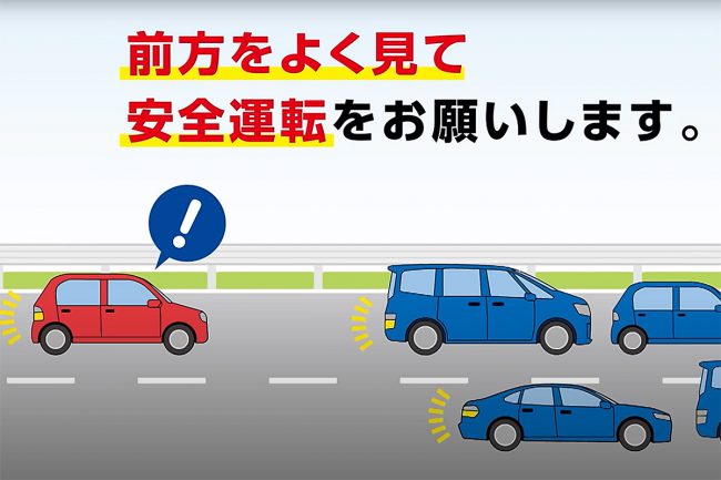 NEXCO中日本においてもハード面での対策として、光の点滅で渋滞を知らせる「渋滞末尾お知らせシステム」の設置や、2車線から1車線へと変わる区間に高輝度ライトの設置、走行中の車両に向かってスピーカーで注意喚起を呼びかけるなど、あらゆる対策をおこなっています。