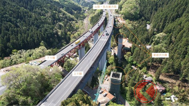 この橋は上り線の北側に新たに建設する橋で、現在の本線から分岐した後、新小仏トンネルに通じます。一番高い橋脚で地上から約50mの高さがあり、橋脚の内側は空洞になっている、とのことです。