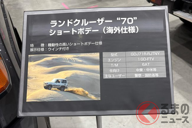 ランクル70のショートボディは、主に中東・中米をメインターゲットにした仕様で、用途としては警察や国防省などで使われているといいます。