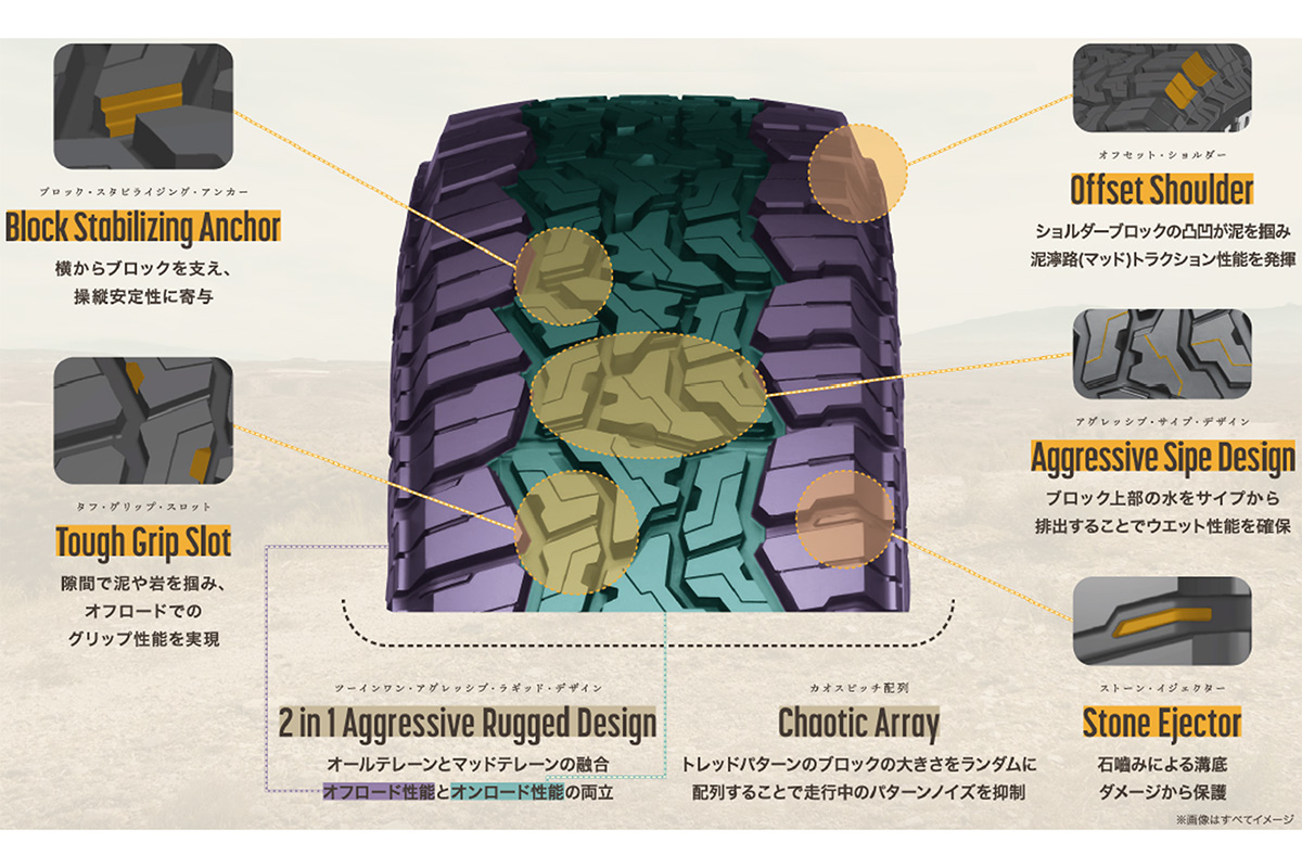 オールテレーン(A/T)タイヤとマッドテレーン(M/T)タイヤの中間に位置づけられる新しいカテゴリーです。