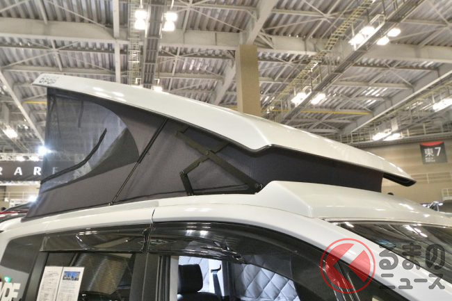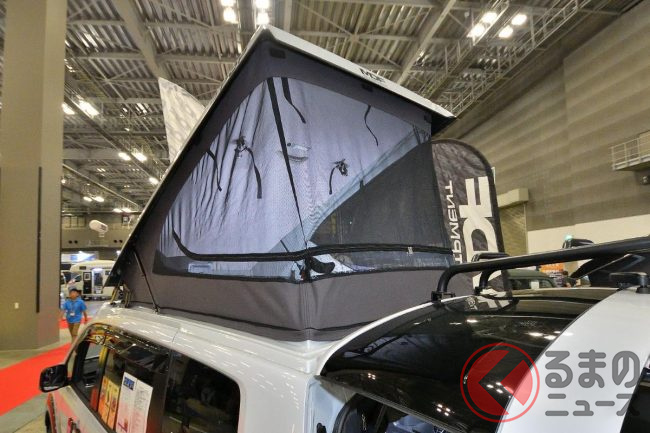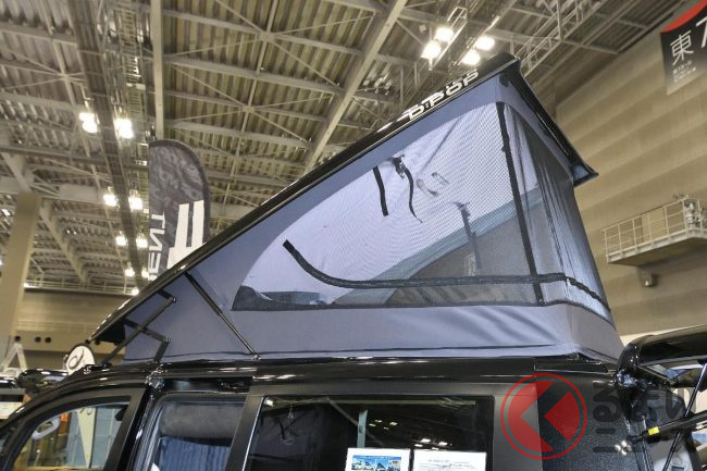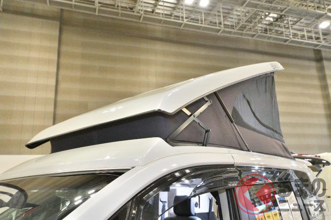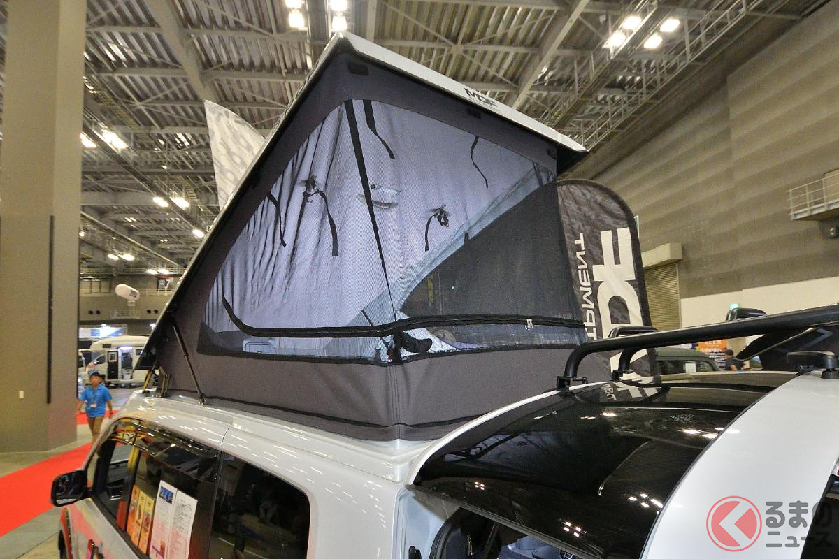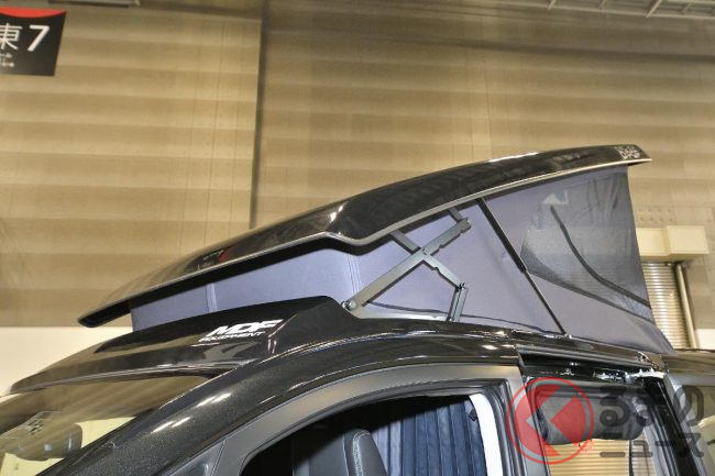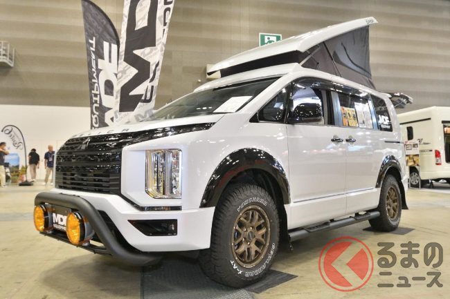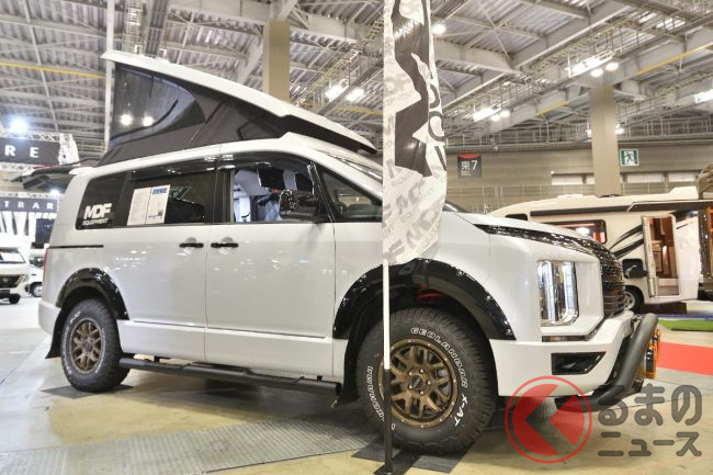 斬新「“2階建て”SUVミニバン!?」がスゴい! 屋根“パカッ”で大人「4人」寝られる!? 車中泊できて悪路もイケちゃう三菱「デリカD:5」! MDFイクイップメント「デリカ“D:POP”」実車公開