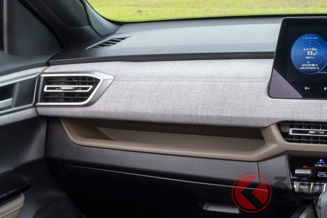 さらに注目すべきは、インストルメントパネルに、このクラスでは一般的な硬質プラスチックではなく、メランジ生地のソフトパッドが広範囲に採用されている点です。