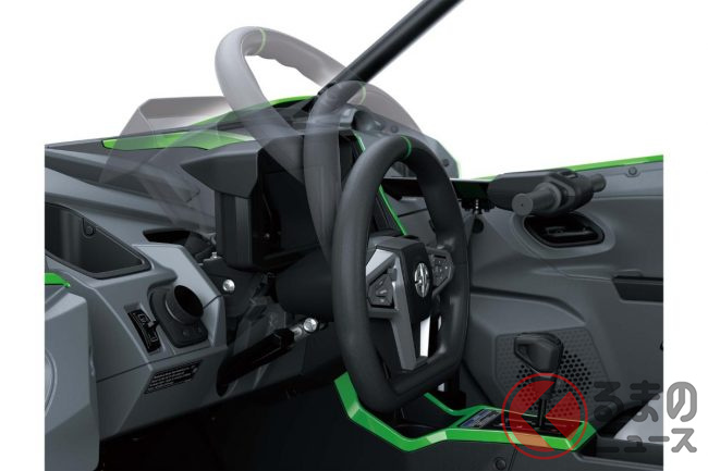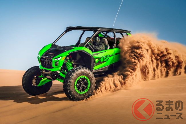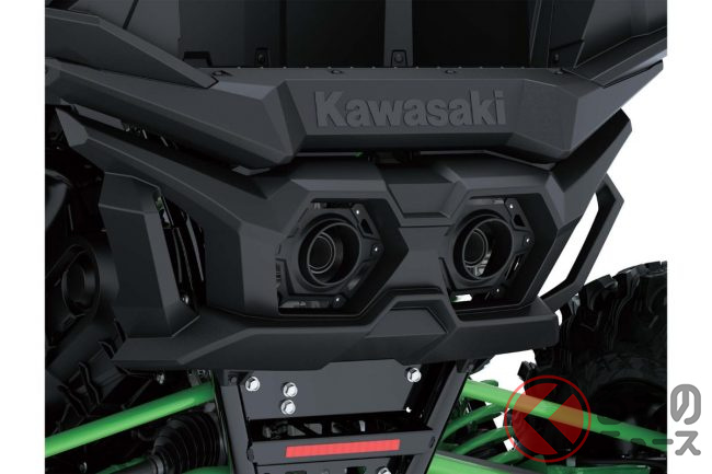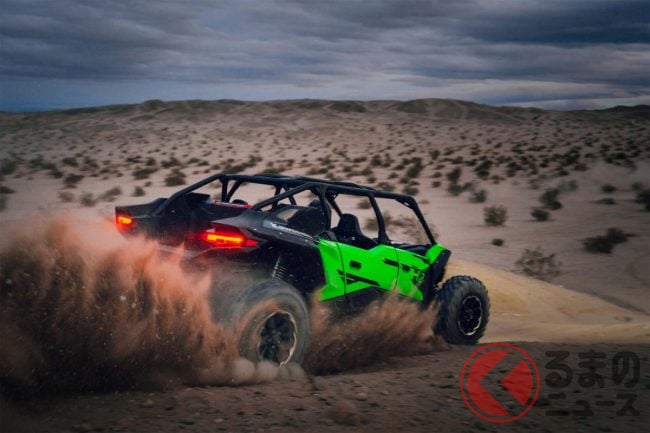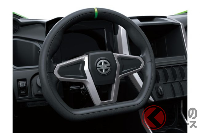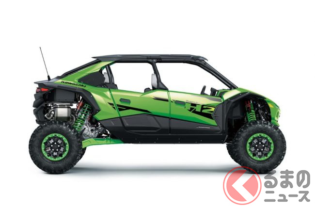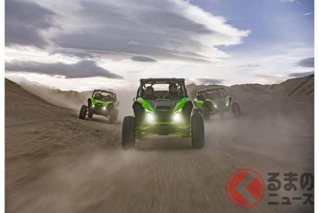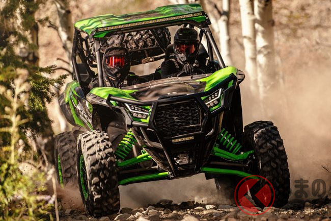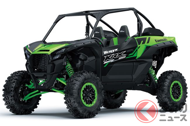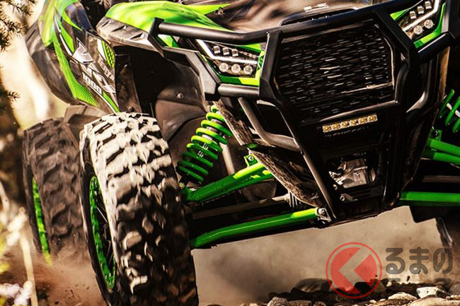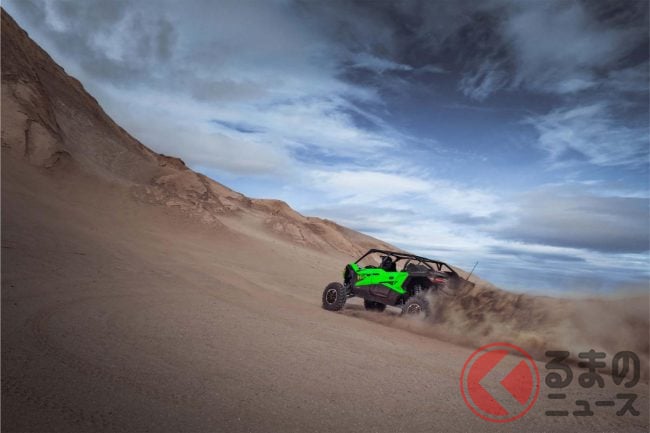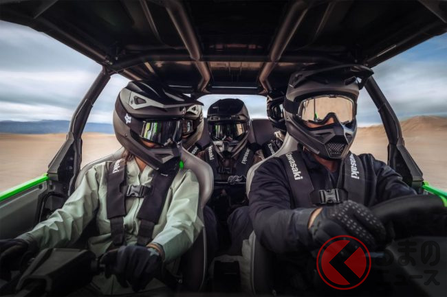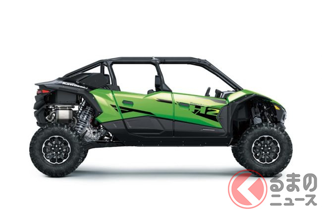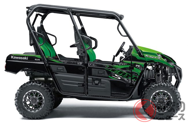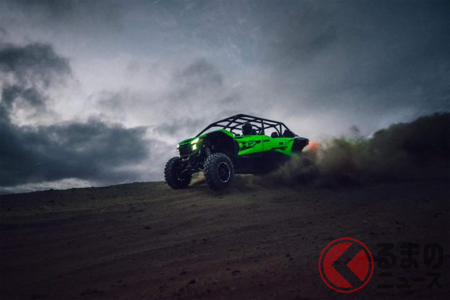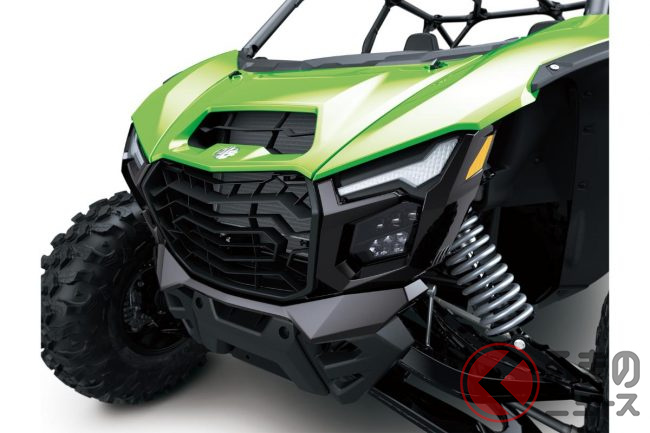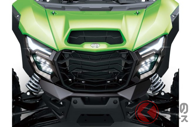 カワサキ新「“5人乗り”スポーツモデル」発表! 全長4m級ボディ×「ニンジャ」の1Lエンジン搭載! 斬新ハンドル&精悍顔がカッコイイ「四輪オフロード車 新TERYX」発売、米国から順次導入