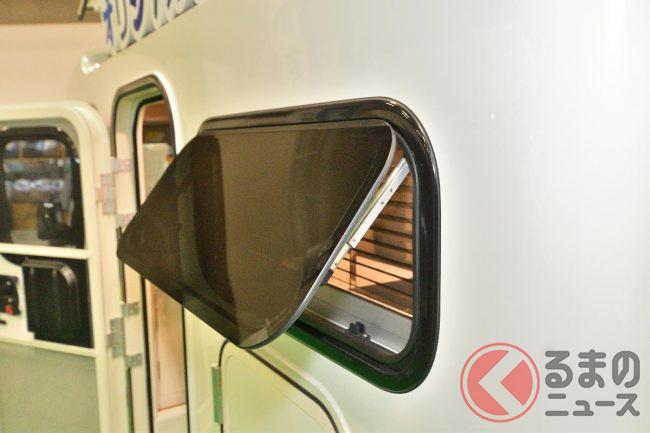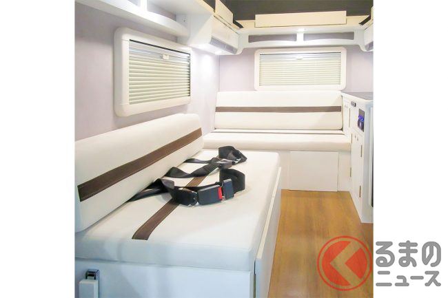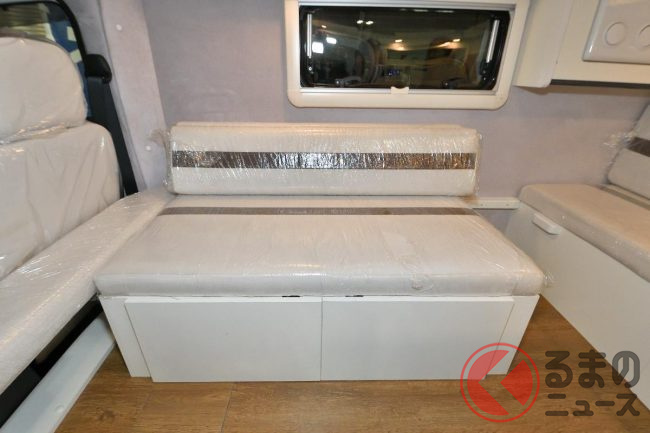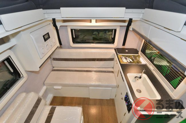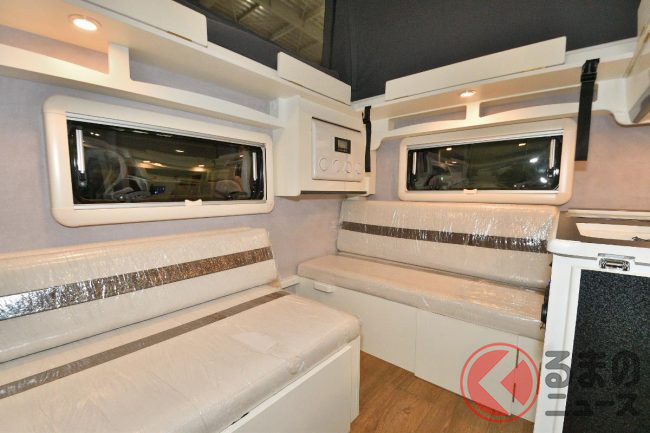 居室部分にはベンチシートや格納式テーブル、蓋つきシンク(給排水タンク付)を装備するほか、床面クッションフロア施工、断熱材施工などがなされており、大きな窓も備えることで開放的な空間を実現。