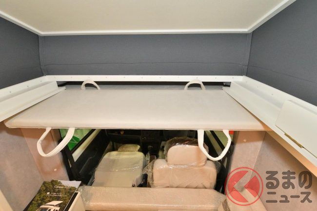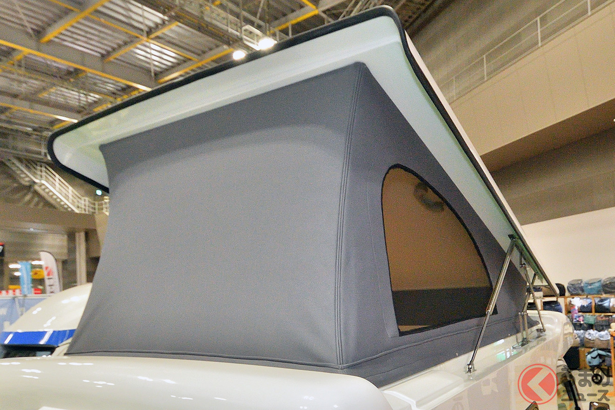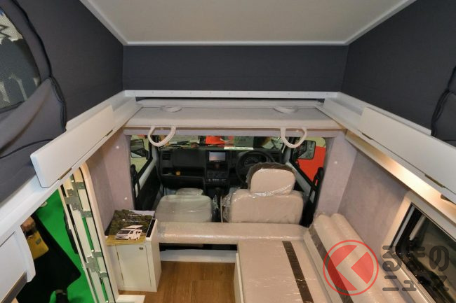 スズキ「“2階建て”軽トラ!?」がスゴい! “4人乗り”で「4人」寝られる「キャリイ」!? 全長3.3m級「軽規格」維持×ひろびろ内装の軽キャンピングカー「モーニングワン キャンパー ジャスト」実車展示