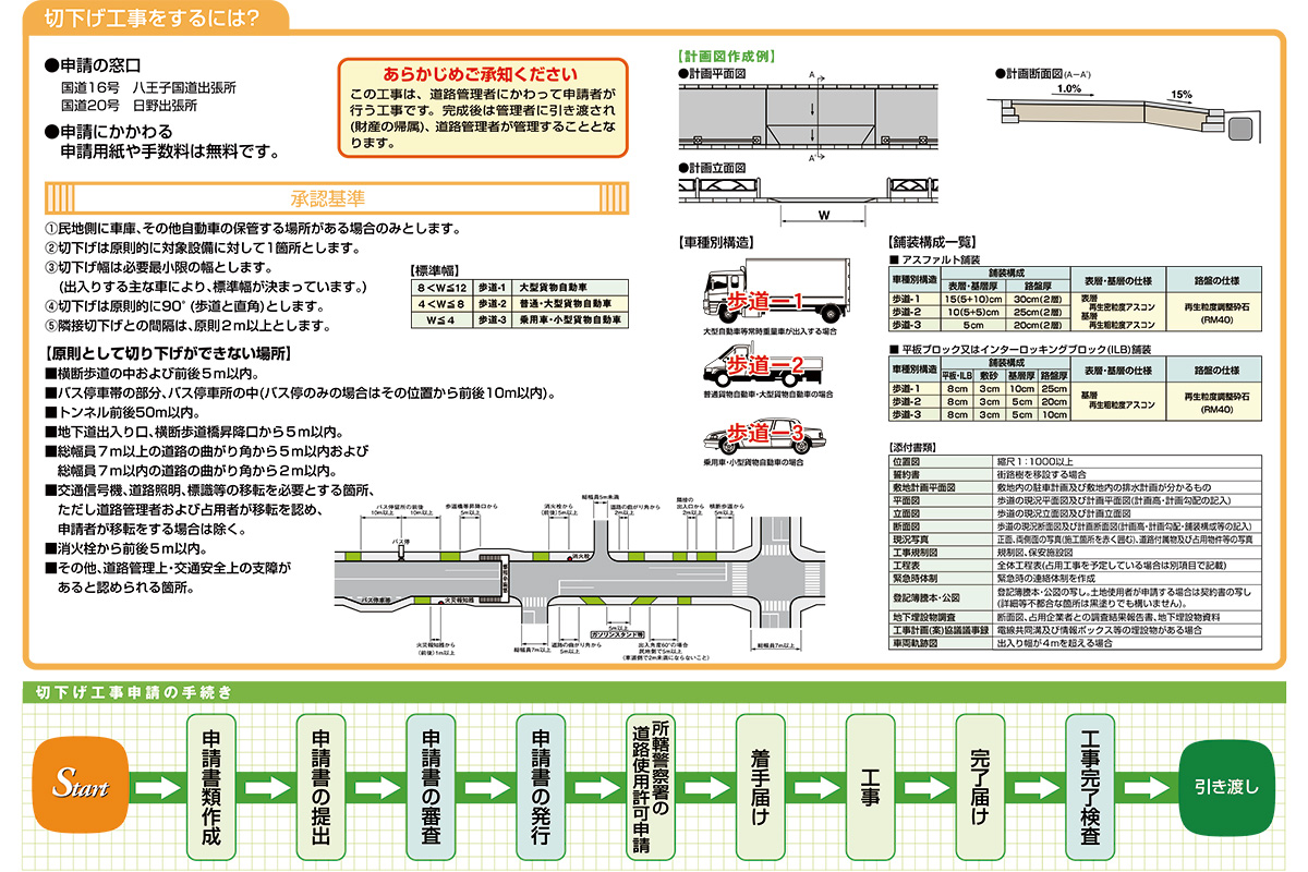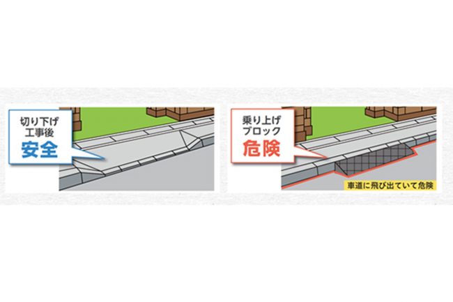 この問題に対し各自治体は、道路法第24条に基づく手続きを経て、自宅や駐車場などの出入口付近をスロープ状にする「切り下げ工事」を推奨しています。