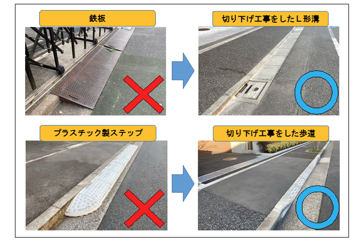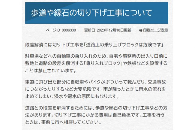費用の問題から切り下げ工事が進まないのが現状ですが、自治体の道路管理部門は「段差スロープの設置は非常に危険なのでやめてほしい」と注意喚起しています。