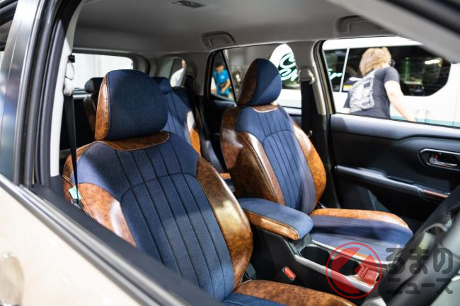 内装ではブラウンとブルーカラーを用いた専用シートカバーや木目調のインパネ、専