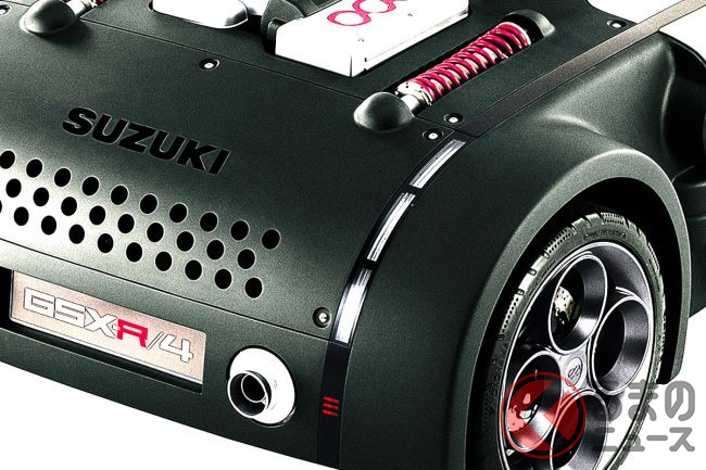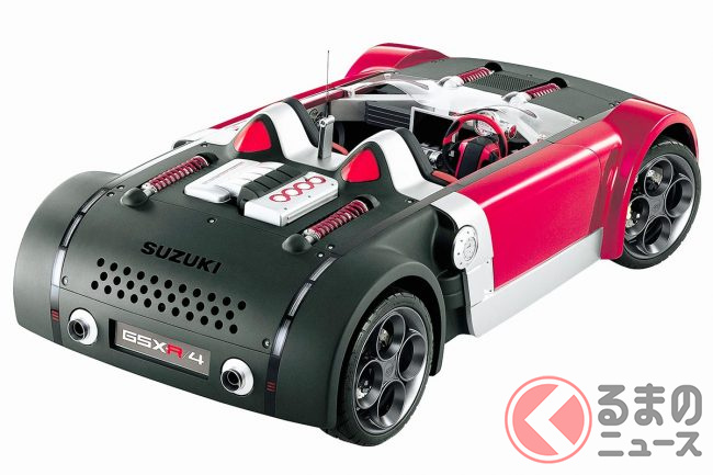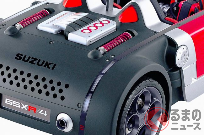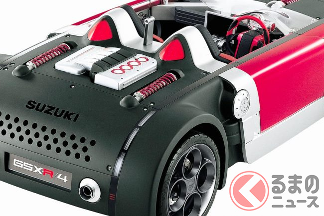 スズキ超本格「MRスポーツカー」がスゴイ! 世界最速バイク「ハヤブサ」の“超高回転エンジン”搭載した「2シーター車」! 待望の「クルマ×バイク」実現した「GSX-R/4」に大注目!