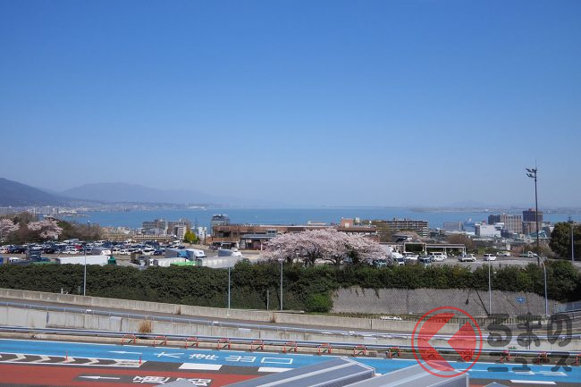 立地はちょうど琵琶湖の南岸のあたりで、直線で数百mほどの至近距離です。特に下り線はやや小高いところに位置しているため、琵琶湖のビュースポットとしても知られています。