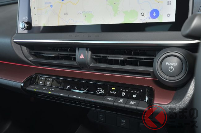 ミニバンやSUV、ハイトワゴンなど背が高く、パノラマのような視界が広がるモデルが多い中、現行プリウスの前席に収まるとAピラーが迫ってくるように感じられますが、デザイン性と低重心な走り、パッケージングを実現するためには必然のフォルムといえるでしょう。