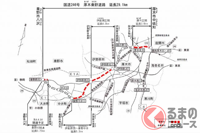 いっぽう厚木秦野道路は、圏央道の圏央厚木IC付近から東名高速の秦野中井ICを経由して新東名高速の秦野西IC(仮称)を結ぶ、延長約29.1kmに及ぶ道路です。