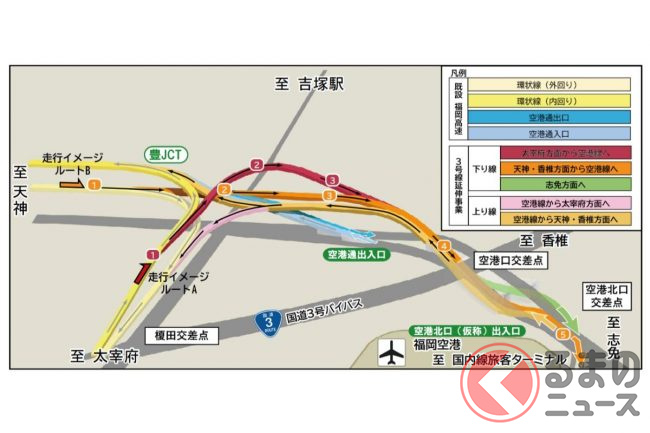 福岡都市高速道路には、福岡高速3号線(空港線)を空港北口交差点付近まで延伸する計画があります。延伸が実現するとどのような効果があるのでしょうか。