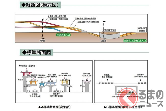 ルートは、既存の空港通出入口から一気に地下に潜り、空港口交差点をアンダーパスで抜け、その先に空港北口出入口を新設する予定です。