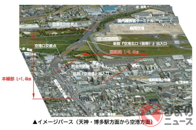 福岡高速3号線(空港線)は、既存の「空港通出入口」をさらに福岡空港側に約1.4km延伸し、「空港北口出入口(仮称)」を新たに建設予定です。