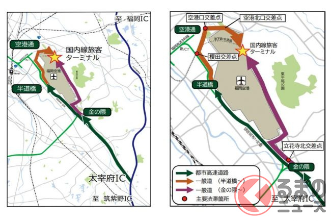 これが完成すると福岡市南部地域や大宰府ICからの国内線ターミナルへのアクセス強化、空港口交差点をはじめとする福岡空港周辺道路の混雑緩和が期待されています。