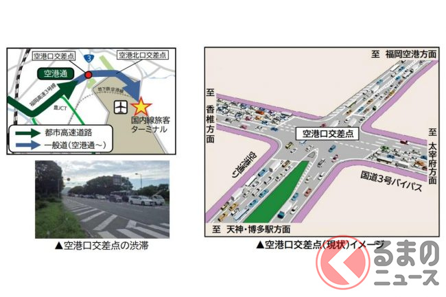 現在、福岡空港3号線は空港通出入口で終点となっているため、空港に行くためには空港口交差点を経由せねばならず、ここでしばしば渋滞が発生しています。