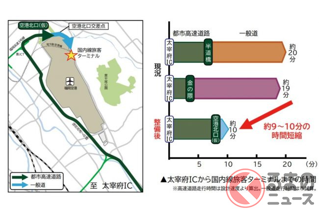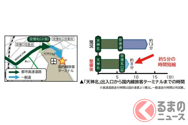 天神北出入り口から国内線旅客ターミナルまでの所要時間は現状と比べて約5分、大宰府ICからは約9~10分の時間短縮効果があるとされています。