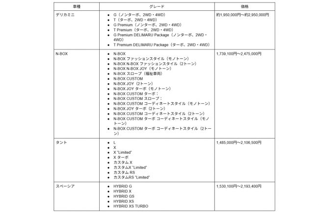 デリカミニ・N-BOX・タント・スペーシアのグレード・価格は画像の通りです。
