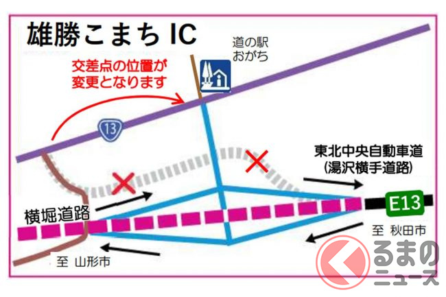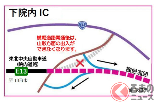 下院内ICでは、横堀道路開通後には山形方面の出入りができなくなり、雄勝こまちICでは、付近の交差点の位置が変更になります。