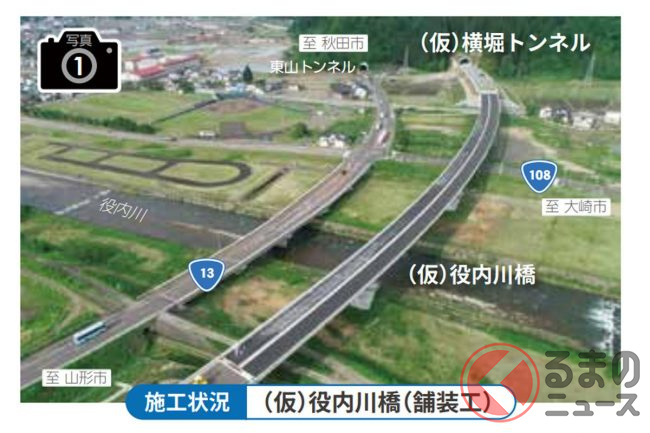 この区間が開通することにより、東北中央道の未開通区間は山形・秋田県境部の「真室川雄勝道路」(7.2km)と、山形県金山町から新庄市にかけての「金山道路」(3.5km)と「新庄金山道路」(5.8km)の2区間になり、全線開通まで大きく前進することになります。