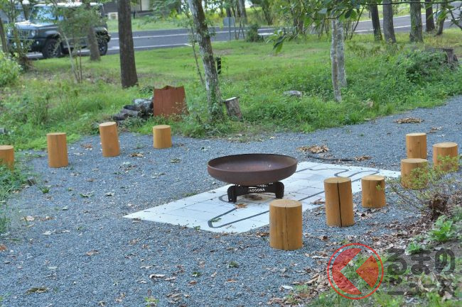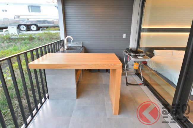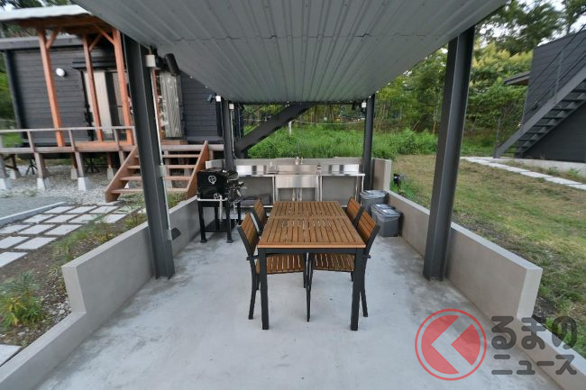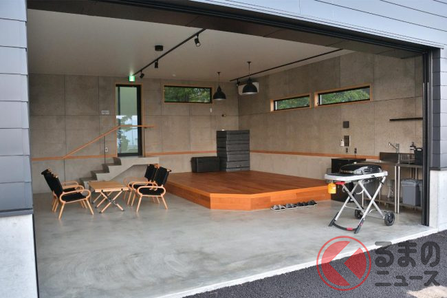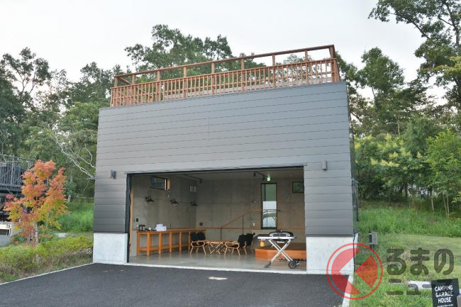 オートキャンプサイトの次に案内してもらったのは、キャンピングガレージハウス。車好きのガレージを疑似体験できるコンセプトサイトで、ガレージ内には就寝スペースがあるほか、冷暖房、BBQガスグリル、キッチン、冷蔵庫も完備。外には焚き火もできる駐車スペースも用意され、“完璧なガレージライフ”を楽しめます。