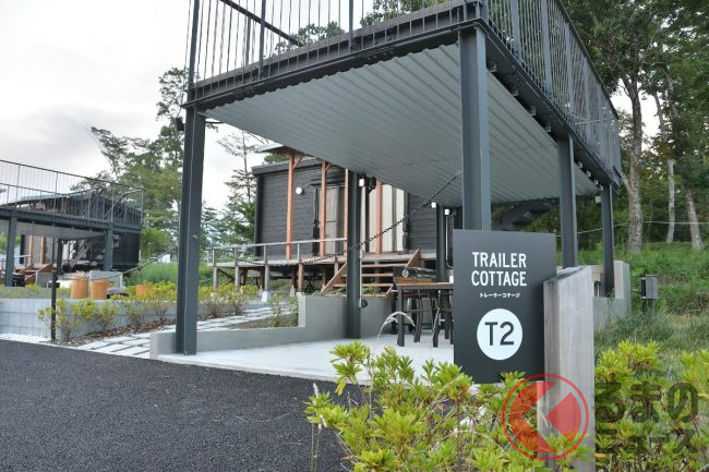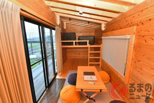 次に案内されたのが、ロフトスペース付・冷暖房完備のトレーラーコテージ。先のキャンピングガレージハウス同様、展望デッキが設けられ、そこからはサーキットを一望できるほか、デッキ下はクルマを停めることもできるので、雨などでクルマを濡らしたくない方にも最適です。