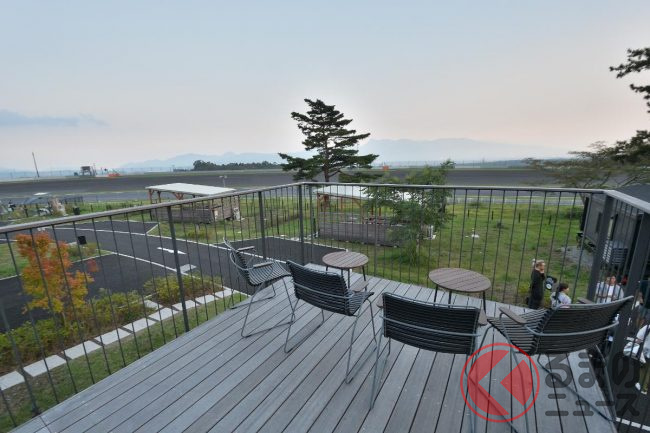 屋上にもテラスが用意され、100Rを駆け抜けるマシンをゆっくり眺められるようになっています。