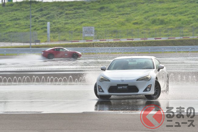 ベーシックな総合トレーニングでも、死角の確認や正しい運転姿勢の習得といった座学のほか、公道では絶対に試せない「高速フルブレーキング」、近年のクルマに装備されている「ABS」や横滑り防止装置「VSC」の体験、低ミュー路の走行も行えます。