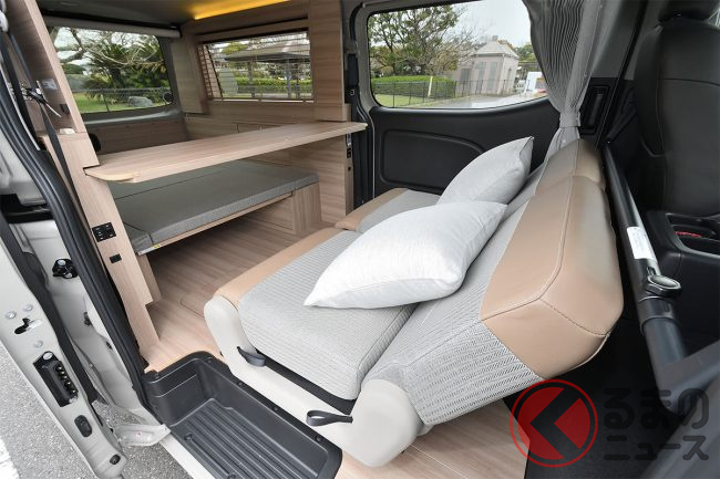 インテリアも、やはり赤いラインの入ったオリジナルのシートを装備。いっぽう、リアのラゲッジルームはフラットベッドになっていて、スポーティながら車中泊やキャンピングなどにも使用できそうな空間に。ベッドの下には荷物を置くスペースも設けられています。