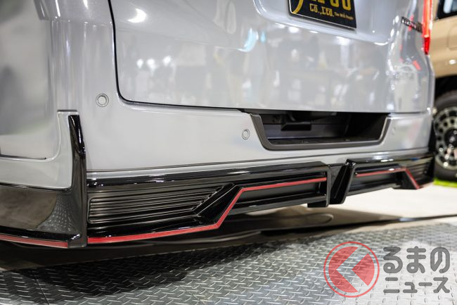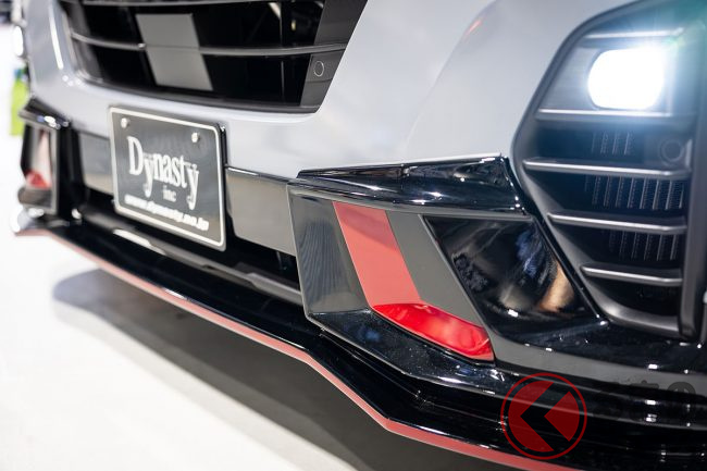 エクステリアは、日産車で用意されるスポーティなカスタムカー「NISMO」のような赤いアクセントカラーを設けたブラックグリルに加え、フロントバンパーはGT-Rの最高峰モデル「GT-R NISMO」を思い起こす、アグレッシブでレーシーなものを装着。