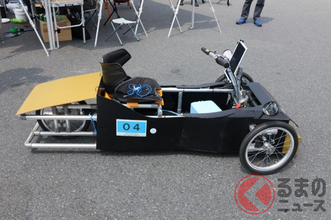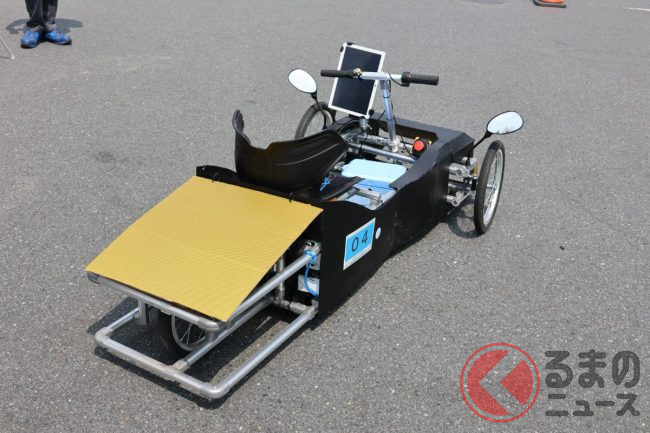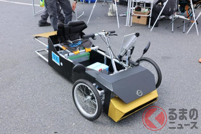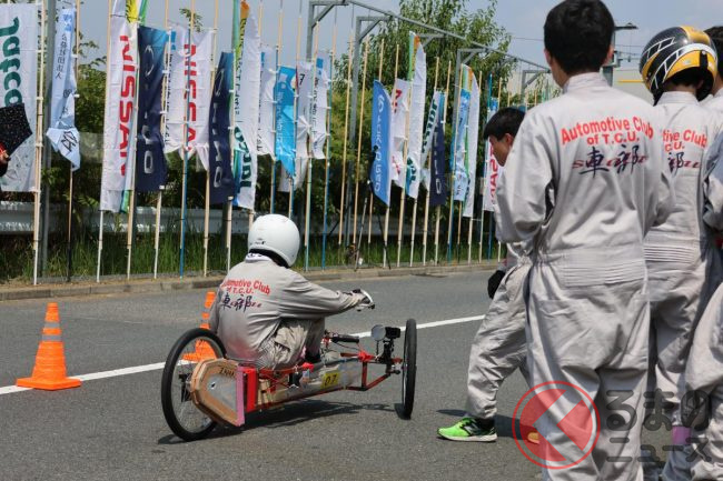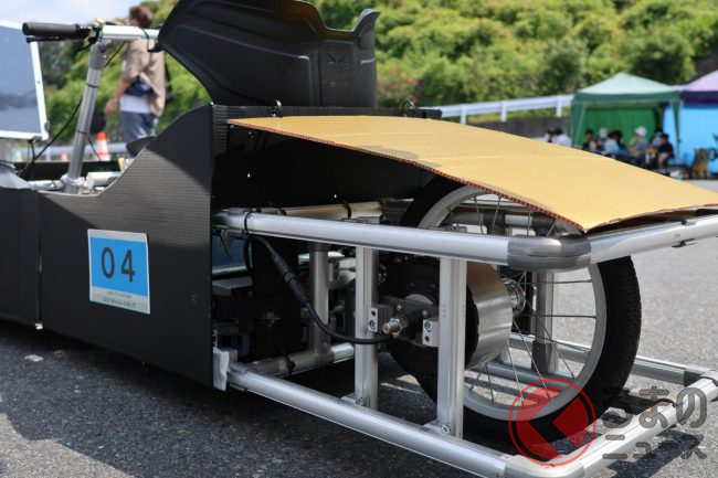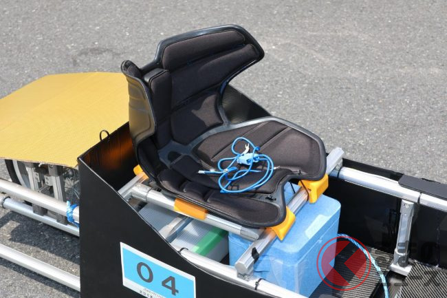 チームリーダーの滝野さんに話を伺うと、当初は、モーターは48V、エネルギー回生を行うという高度なシステムで、最高速度60km/hを想定していたそうですが、実際に走らせてみると、暑さや重量などが原因でバッテリー容量が不足し、完走できないことが判明。そこで最終的には、レースでの最高速度記録か、完走かの決断を迫られたといいます。