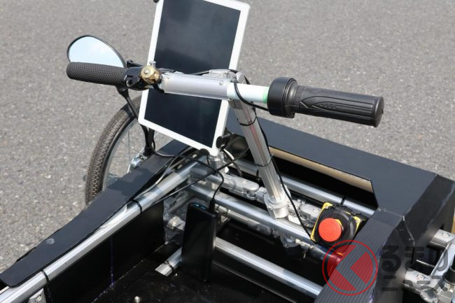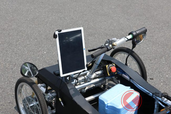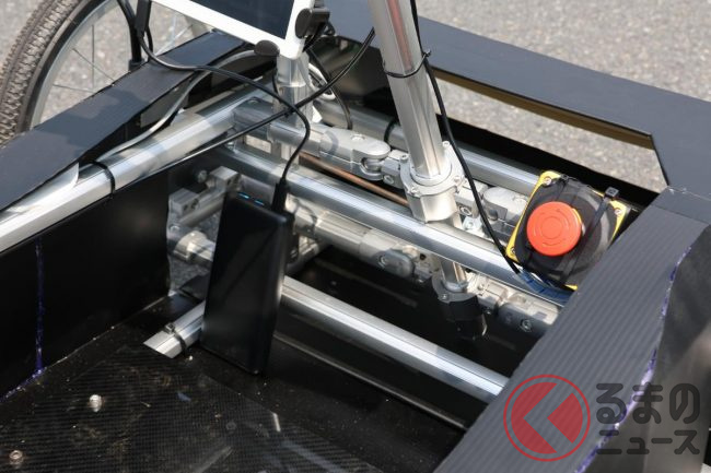 まずはマシンスペックを紹介しましょう。ボディサイズは、全長1700mm×全幅800mmで、車両重量が25.5kg。シャシは、アルミ製のグリーンフレームを採用。ステアリング機構は、ラック&ピニオン式とすることで、シンプルかつスムーズな操作を実現しています。レイアウトは、フロントが2輪、リヤが1輪の3輪車で、後輪駆動仕様に。モーターには、軽量なコアレスモーターを搭載しています。