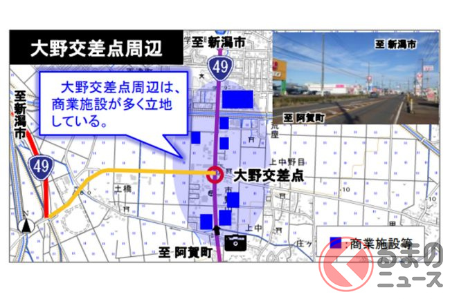 現道は阿賀野市の市街地を通過するため、慢性的な渋滞が発生。大型車の通行もあるため渋滞や交通事故が頻発しています。