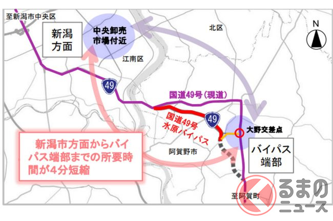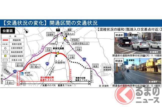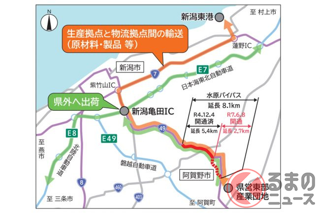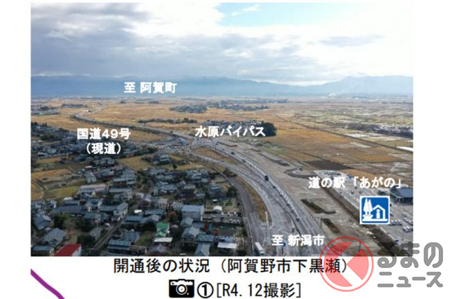 2025年6月8日、新潟県阿賀野市を通る国道49号「水原バイパス」が全線開通しました。これが開通するとどのような効果が見込めるのでしょうか。