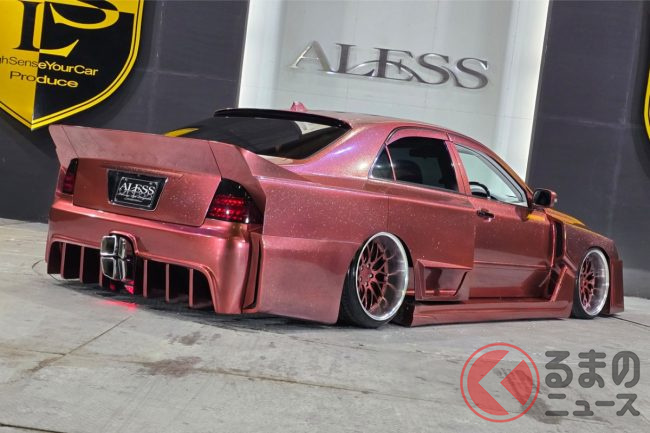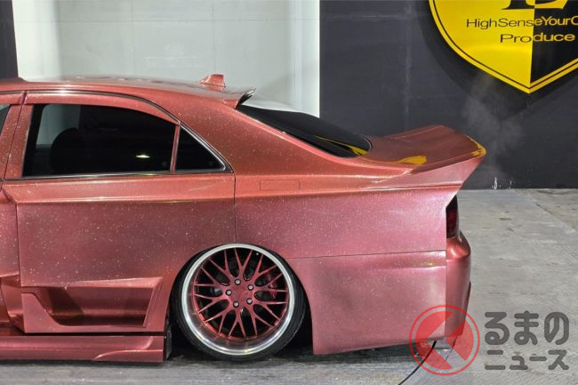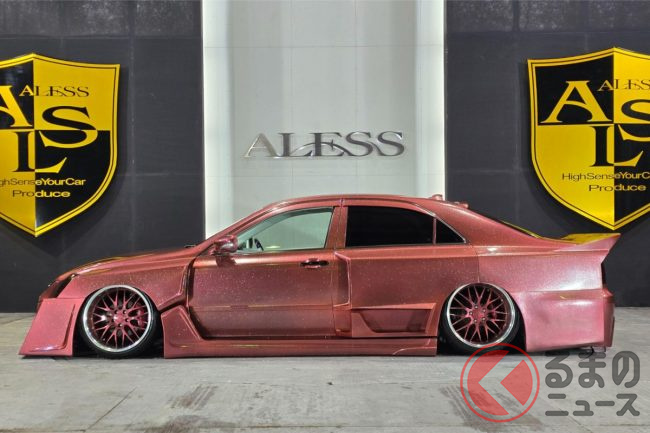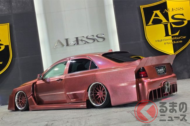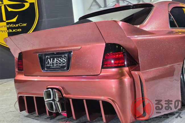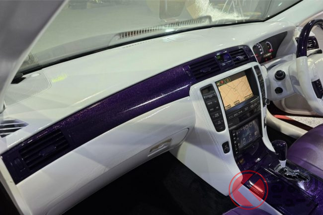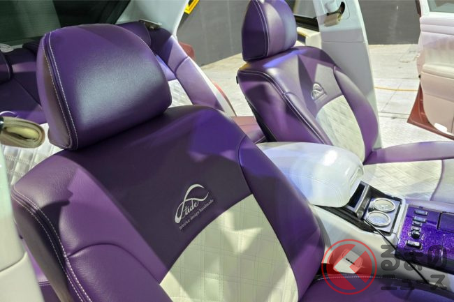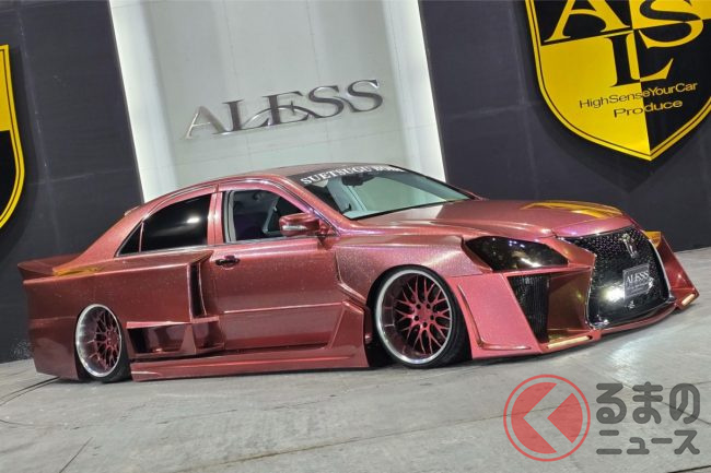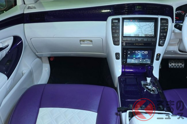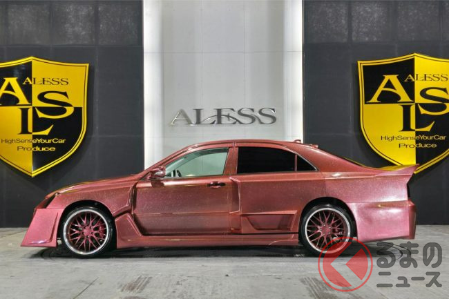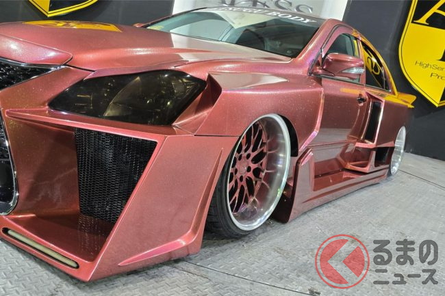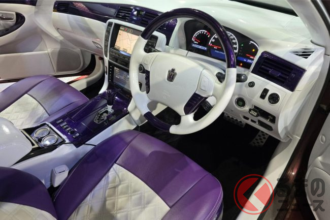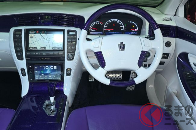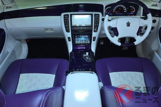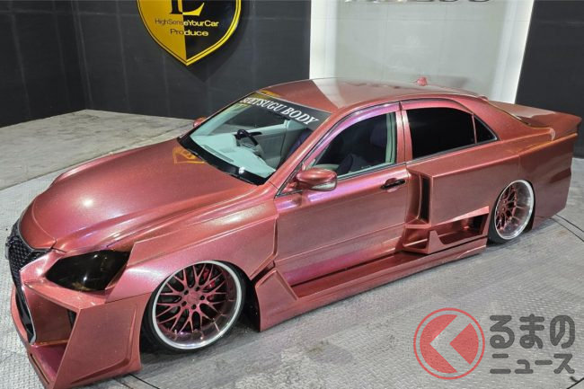 トヨタの「斬新セダン」に注目! スゴい顔に鮮烈「マゼンタピンク」&“紫インテリア”採用! ド迫力の4本出しマフラー装備 「クラウン」の唯一無二のカスタム仕様とは