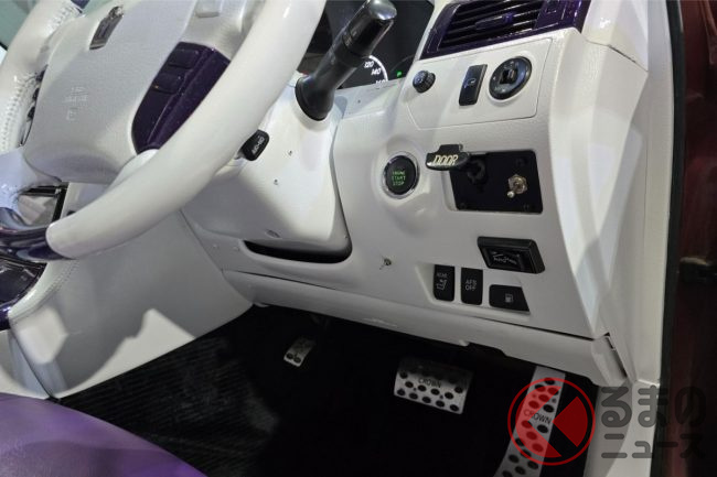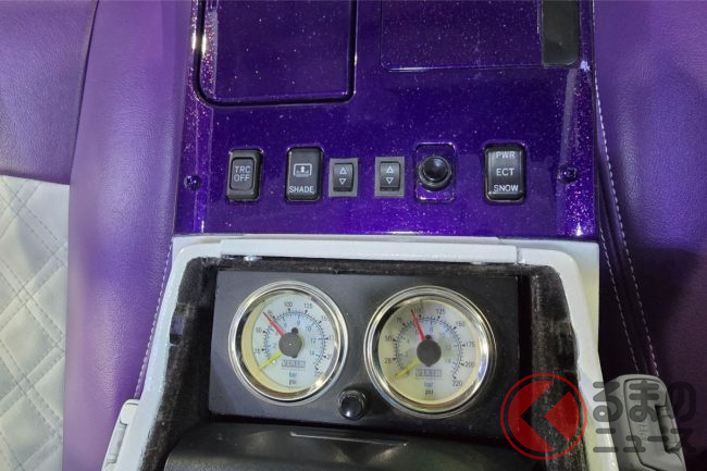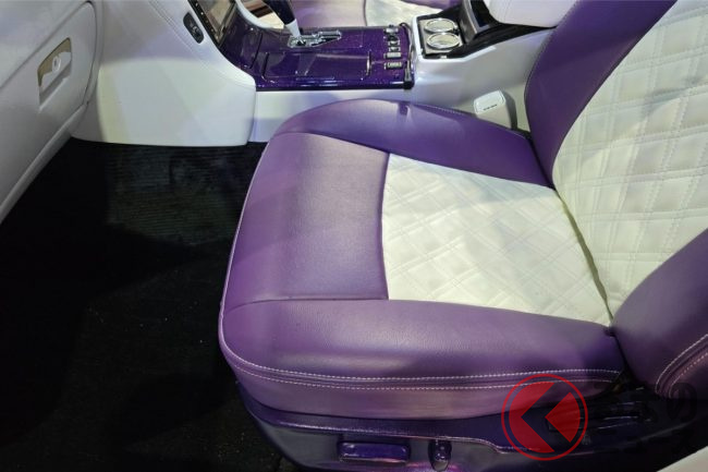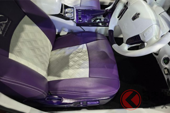 インテリアもまた徹底したカスタマイズが施されており、紫を基調としたインテリアが独特の雰囲気を演出。さらに社外ナビが装着され、Bluetoothにも対応しているため、現代的な利便性も確保されています。