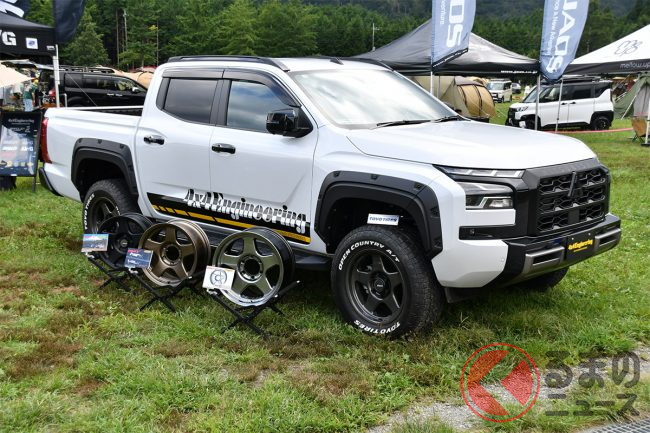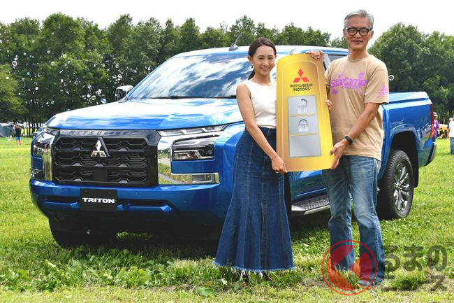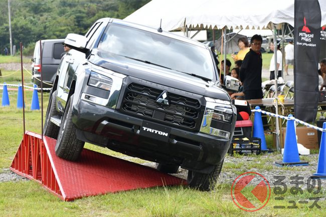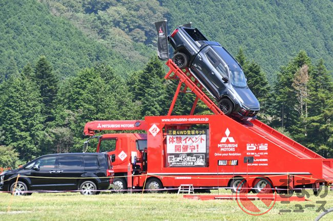 三菱のイベントでおなじみの、最大傾斜45度の4WD登坂キット同乗体験会も人気コンテンツで、参加したデリカD:5とトライトンが迫力ある走行シーンを披露。トライトンは、45度登坂を前進ではなく後退しながら登る(!)場面もありました。